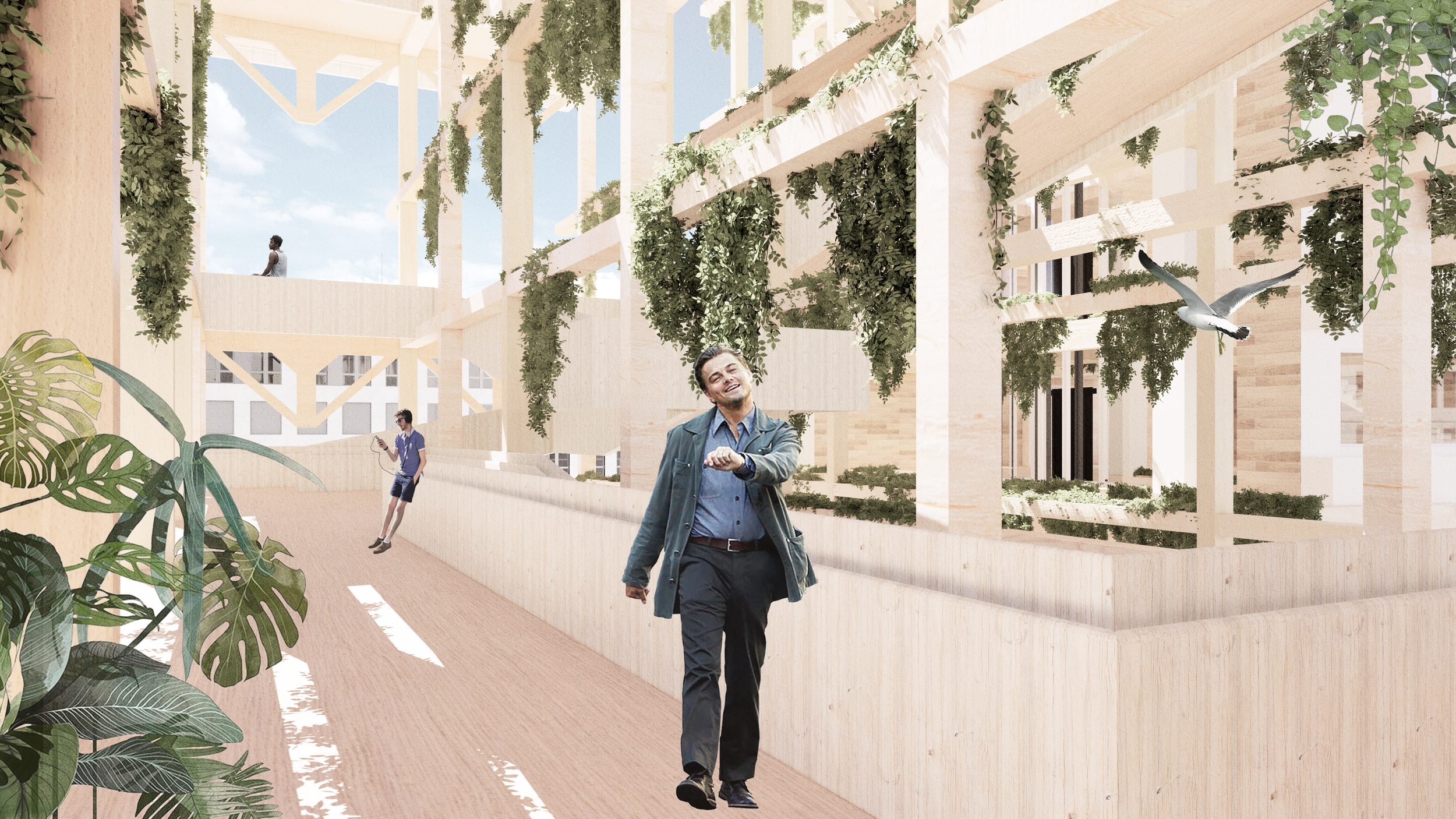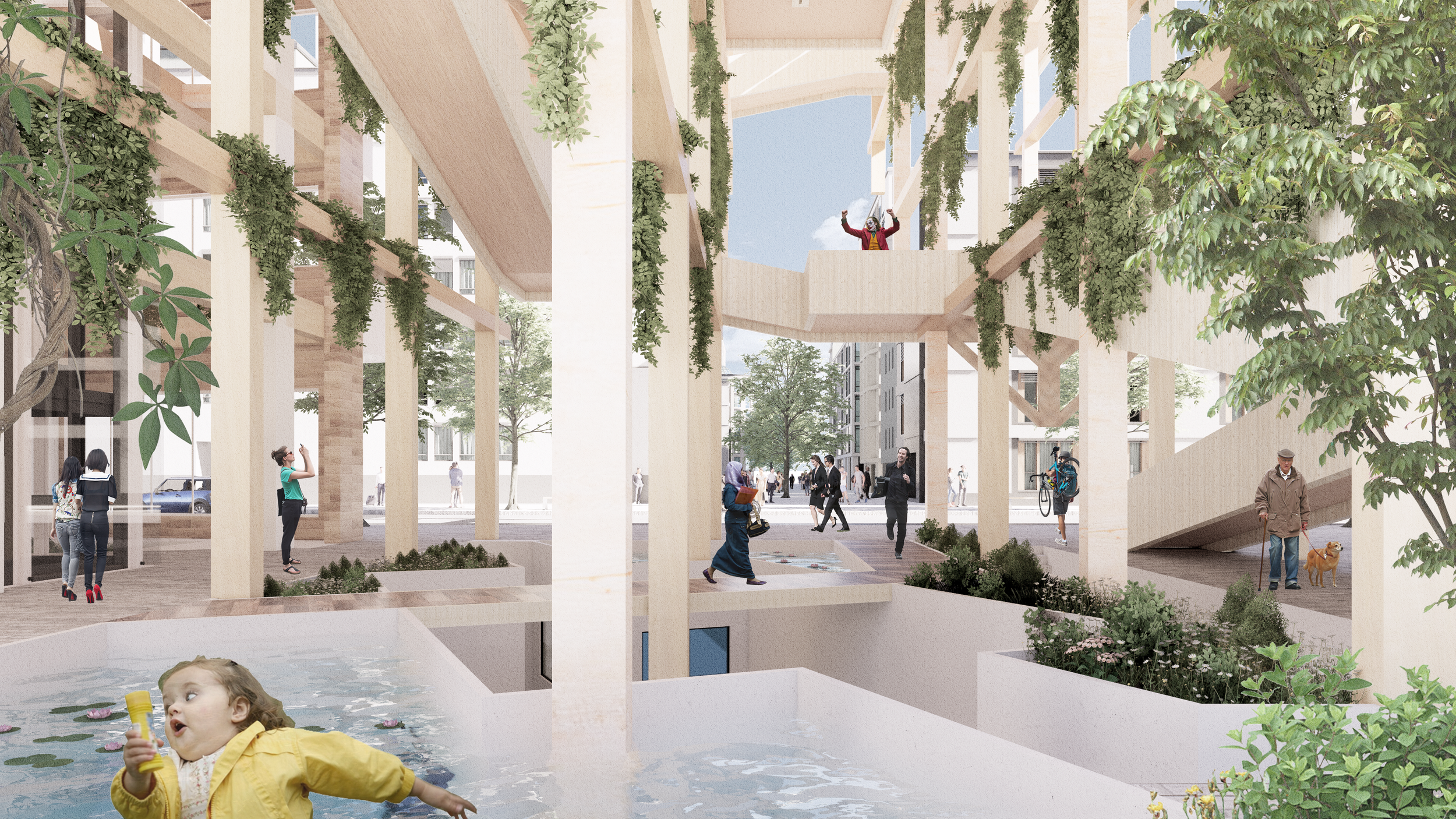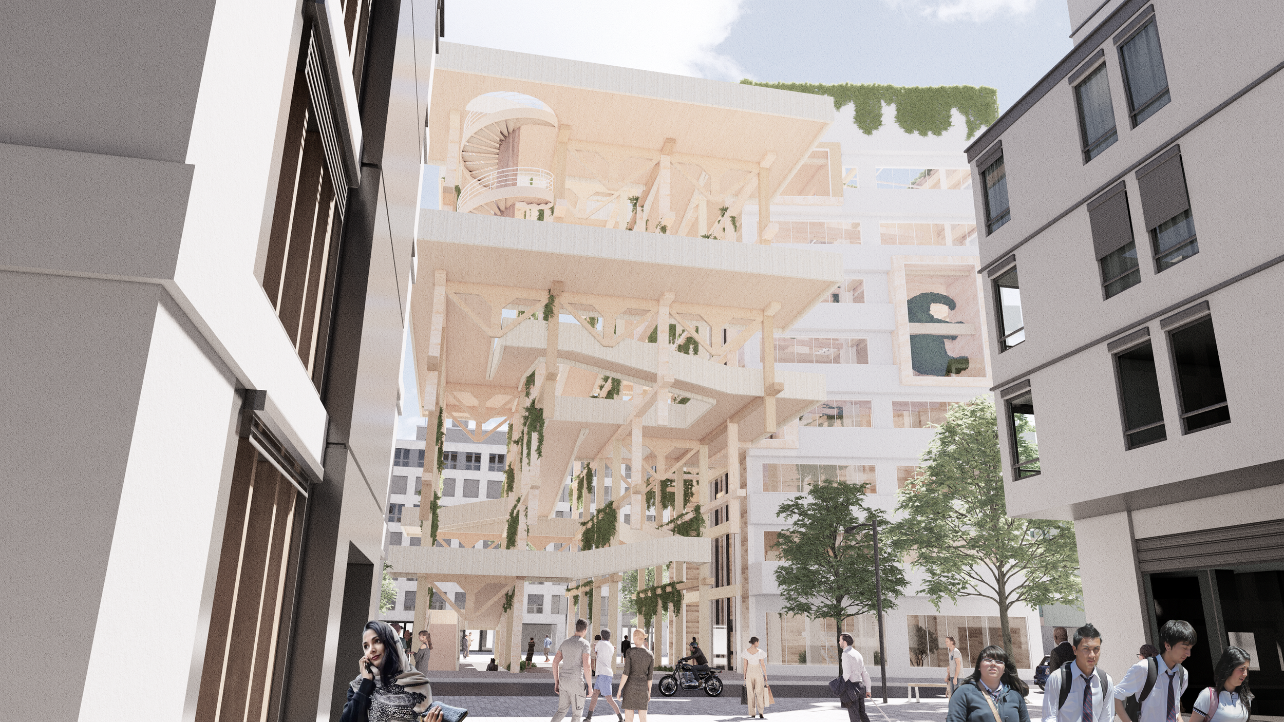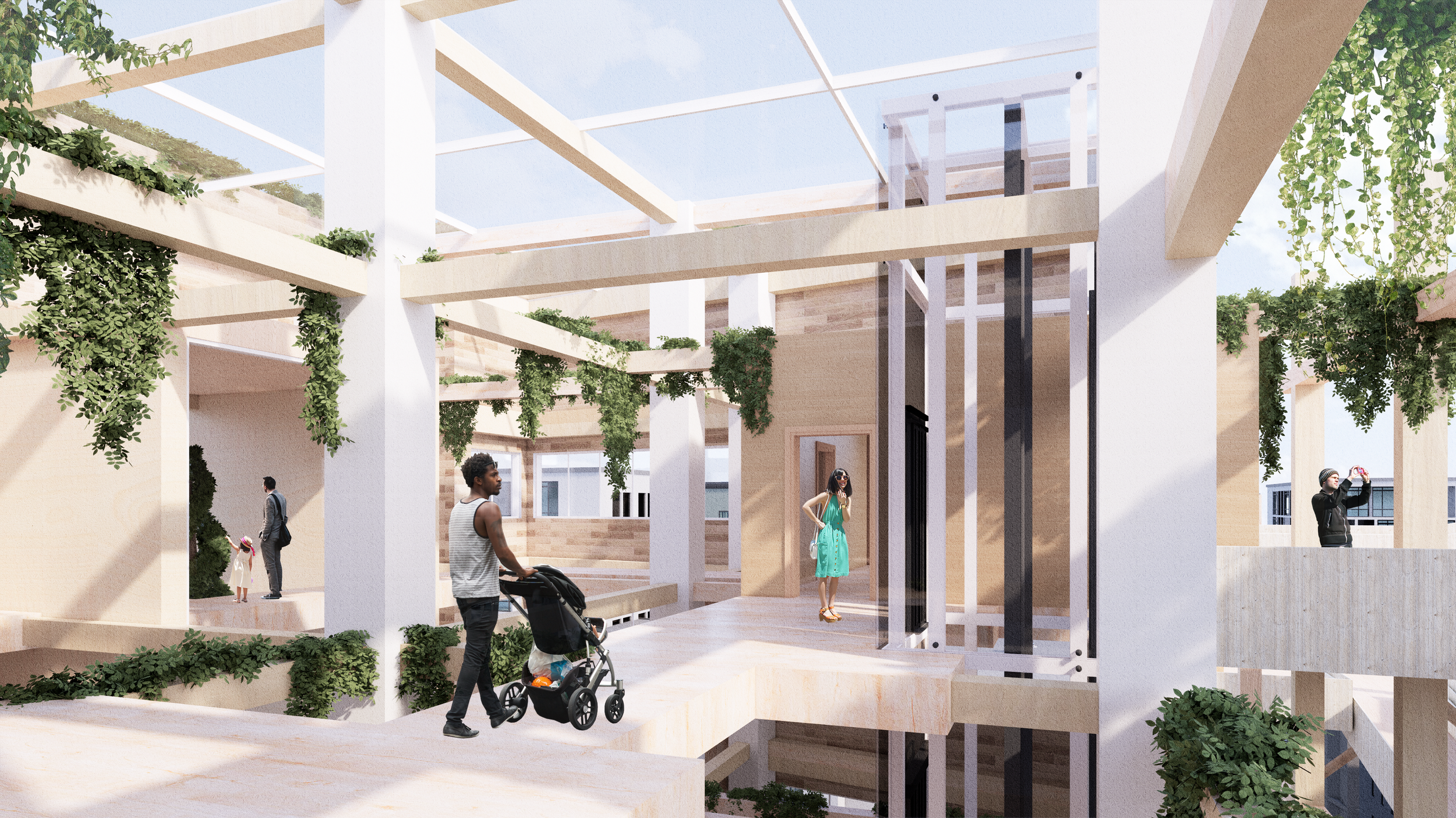 The proposal includes renovation of the existing office building that transforms it into a landscape art gallery, and an exterior timber pavilion structure with pedestrian platforms that links the building.