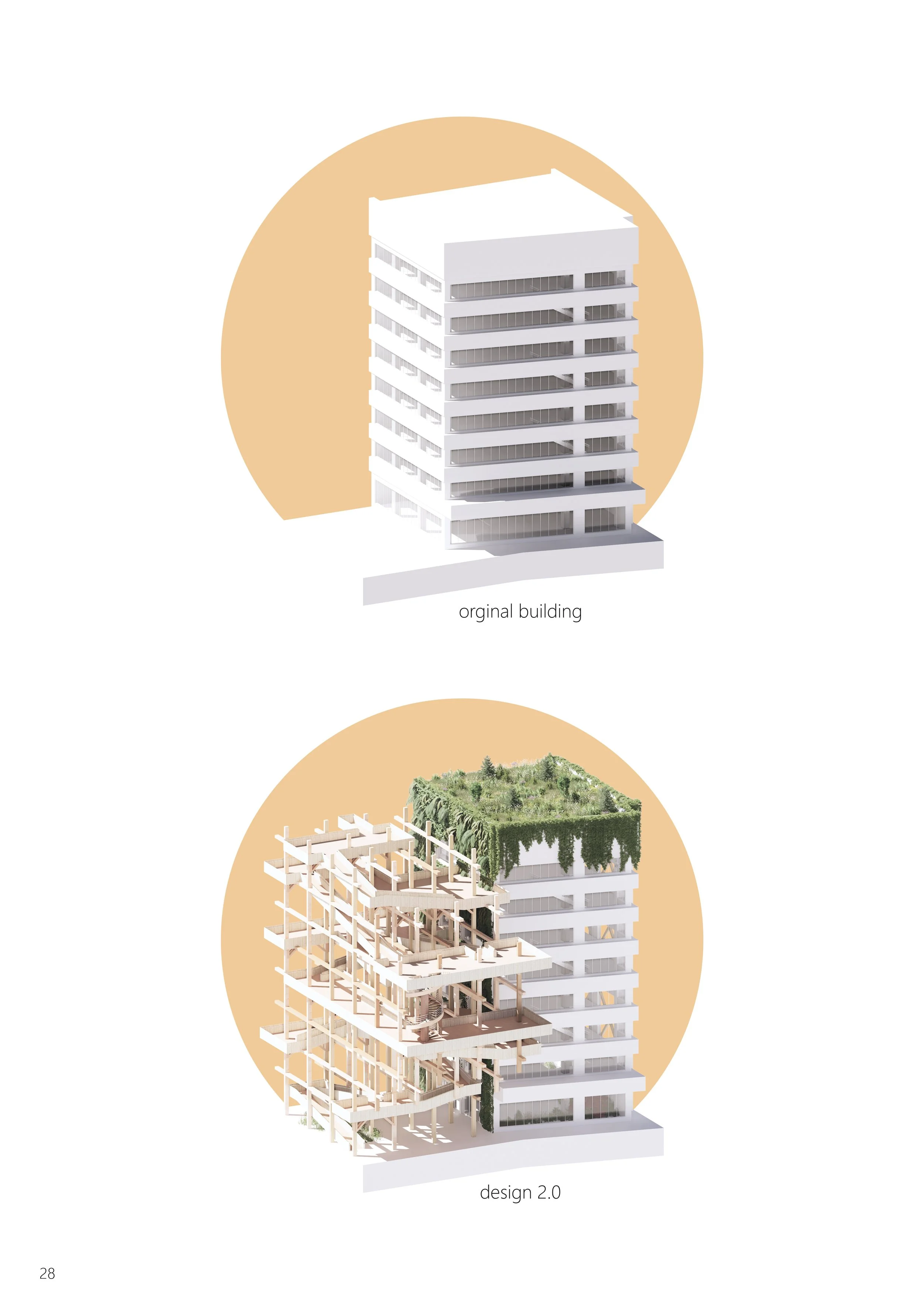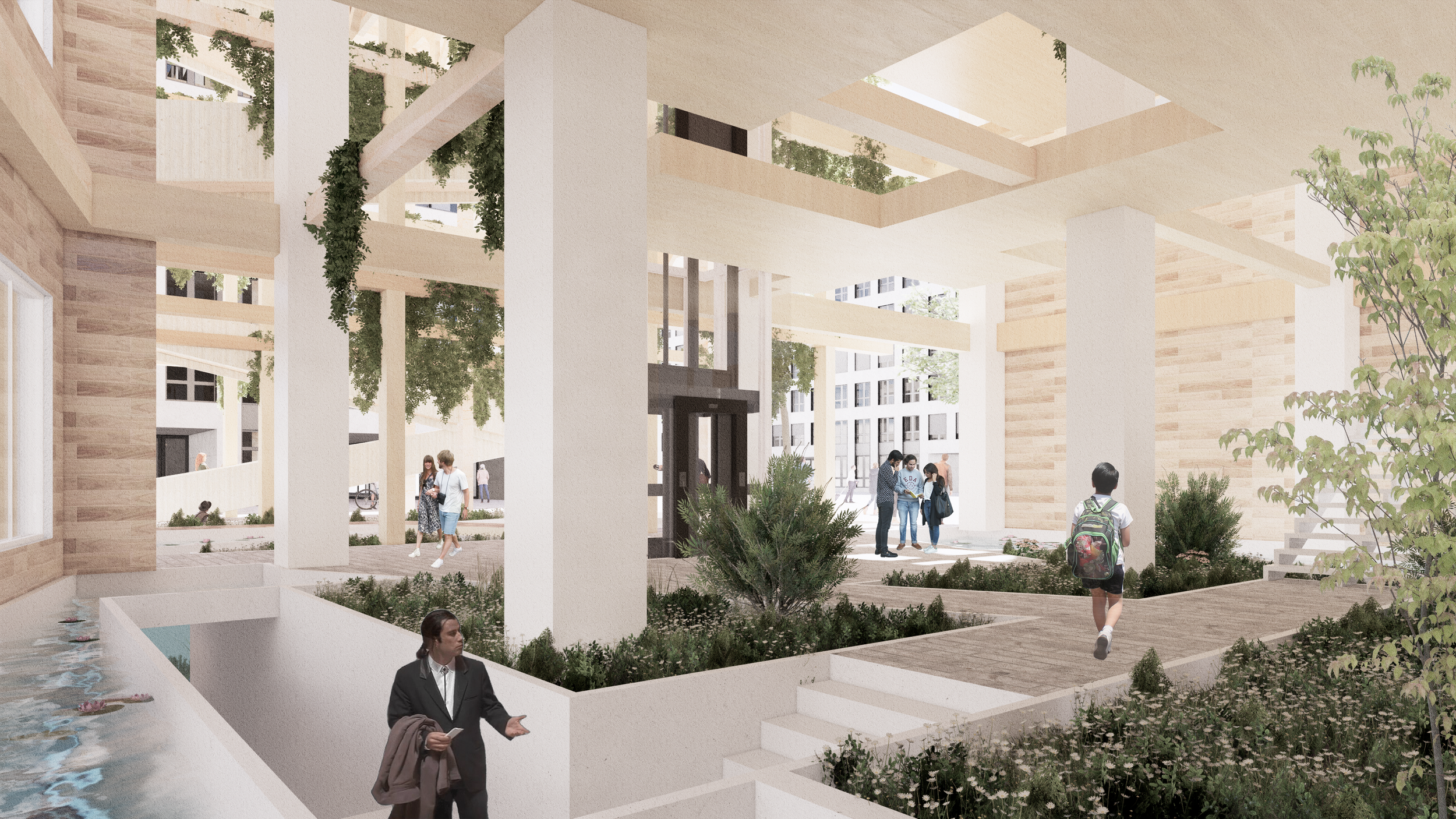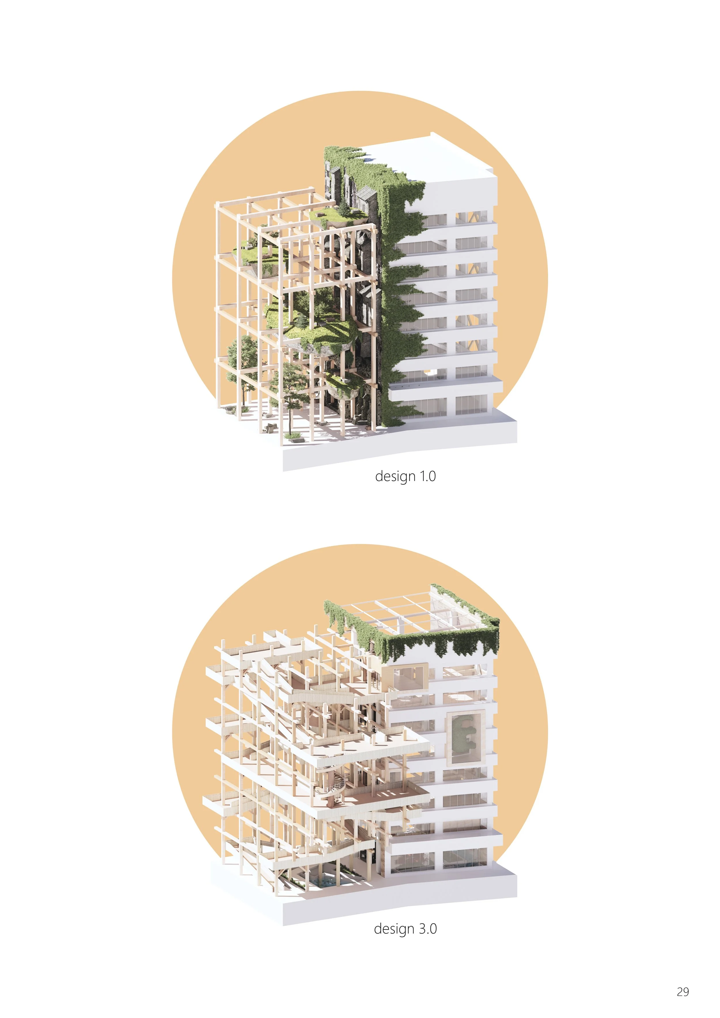The proposal includes renovation of the existing office building that transforms it into a landscape art gallery, and an exterior timber pavilion structure with pedestrian platforms that links the building.
