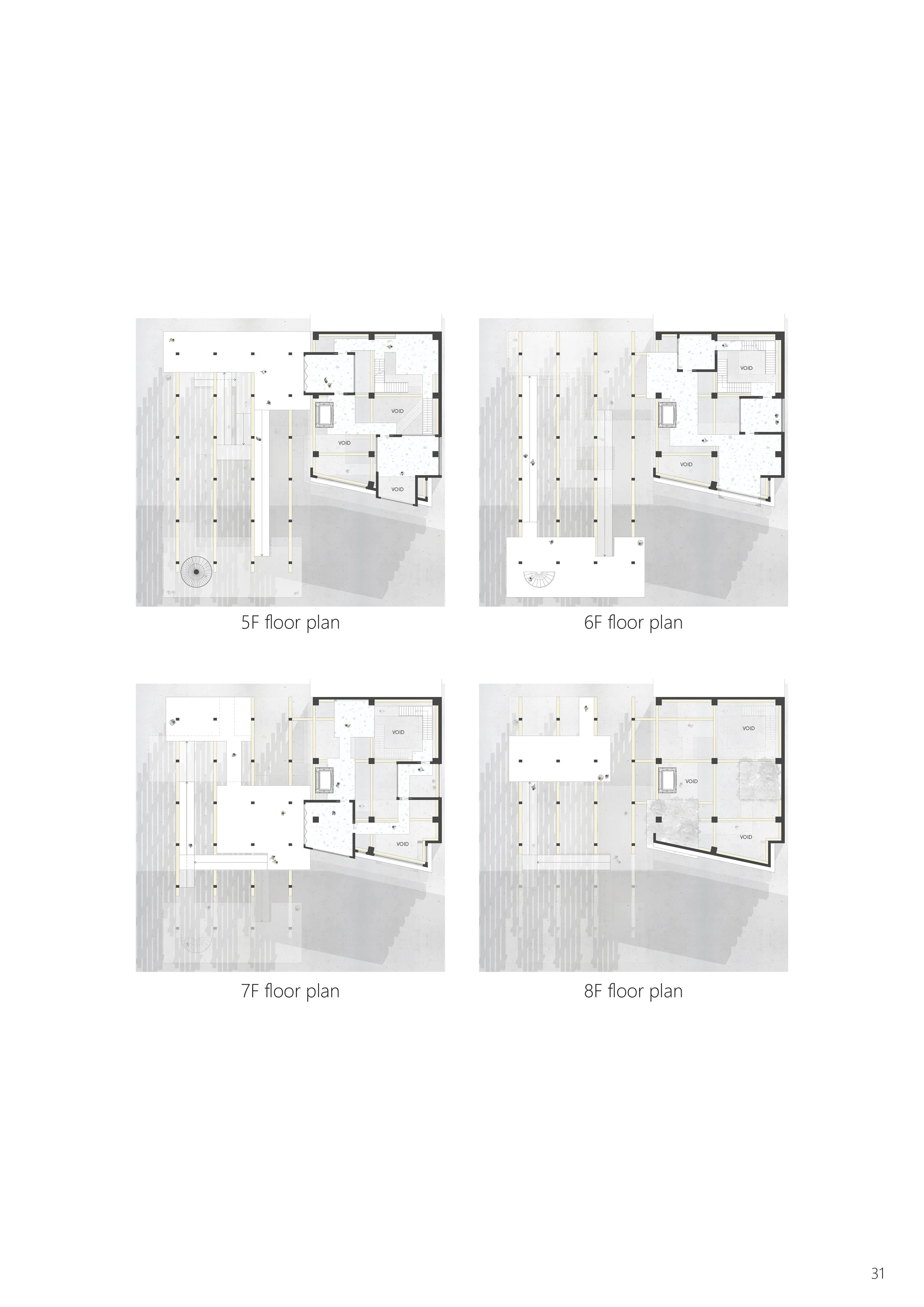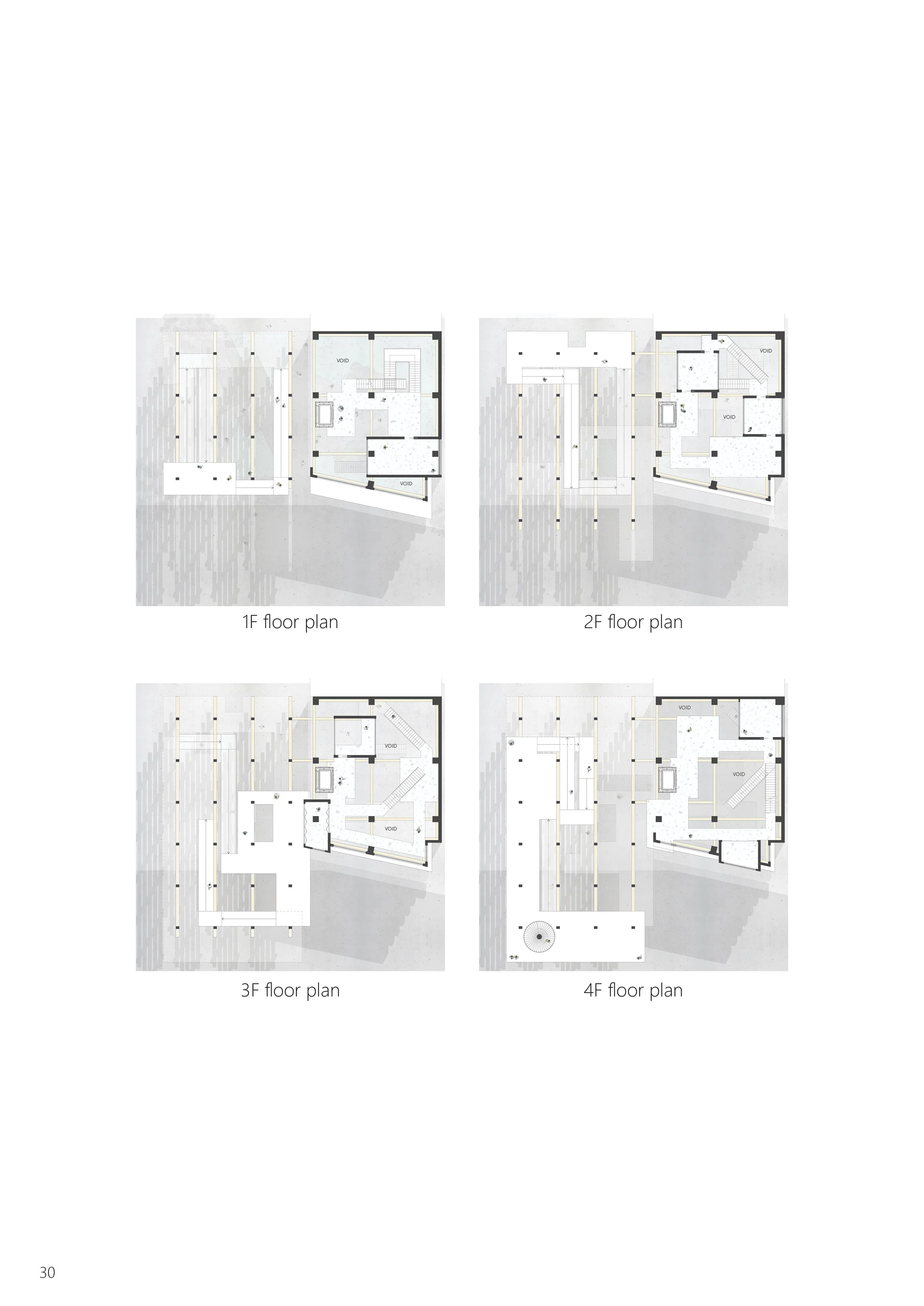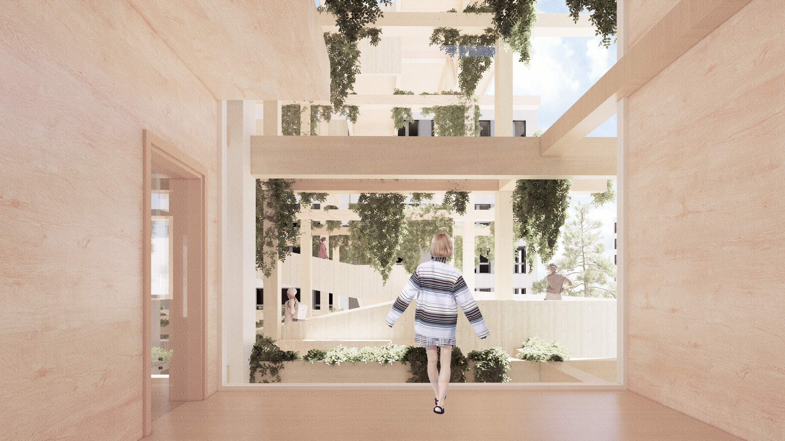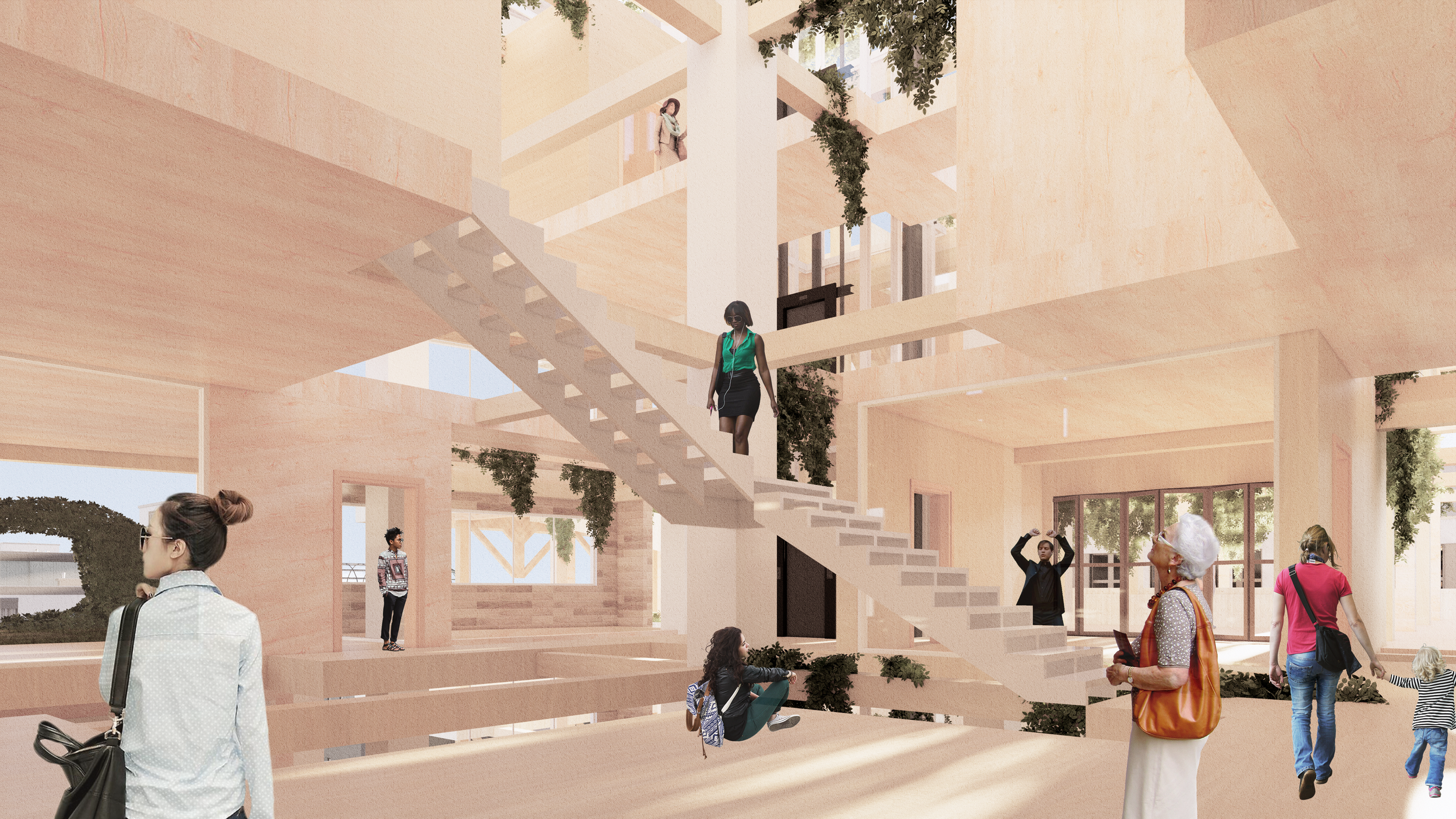 The proposal includes renovation of the existing office building that transforms it into a landscape art gallery, and an exterior timber pavilion structure with pedestrian platforms that links the building.