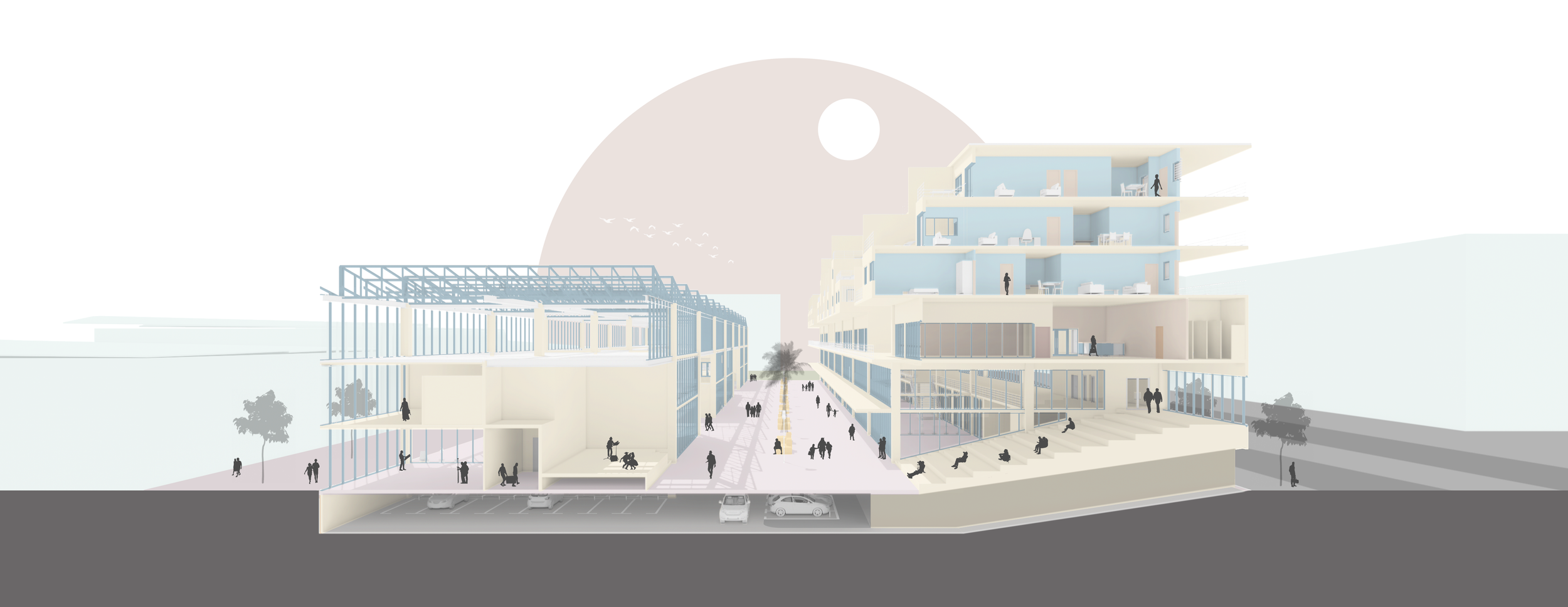 The mix-use building has two stories of commercial use, and three stories of residential use. It aims at increasing housing supply and choice, forming a stable community and offering more job and entrepreneurial opportunities.