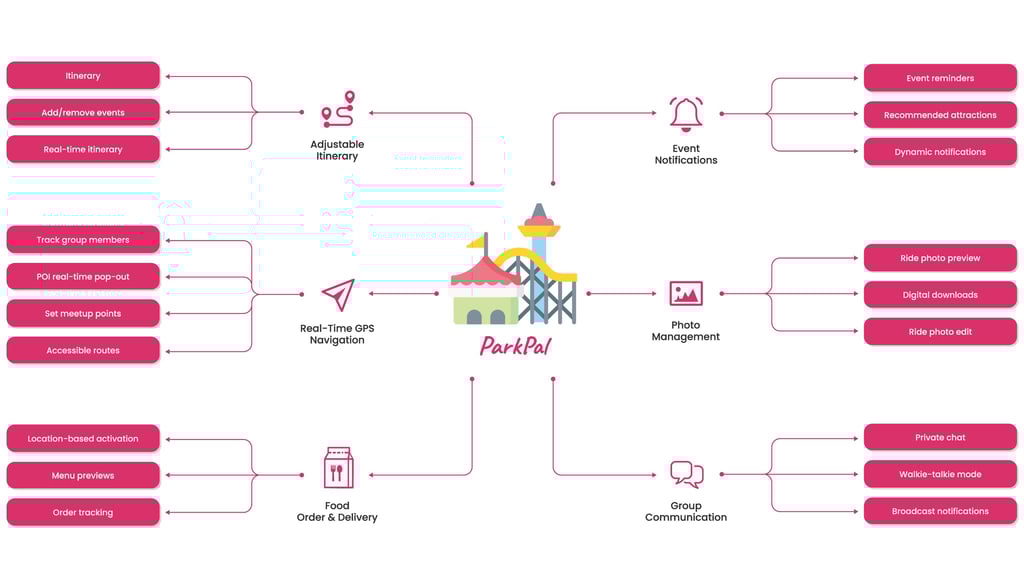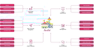By addressing pain points such as group tracking, safety, and efficient navigation while introducing innovative features to adapt futural potentials like robot food delivery, ParkPal can cater to a diverse audience, from families to tech-savvy adventurers. This differentiation positions it as not just a tool for theme park visitors but a transformative solution for enhancing group experiences in various settings.