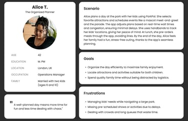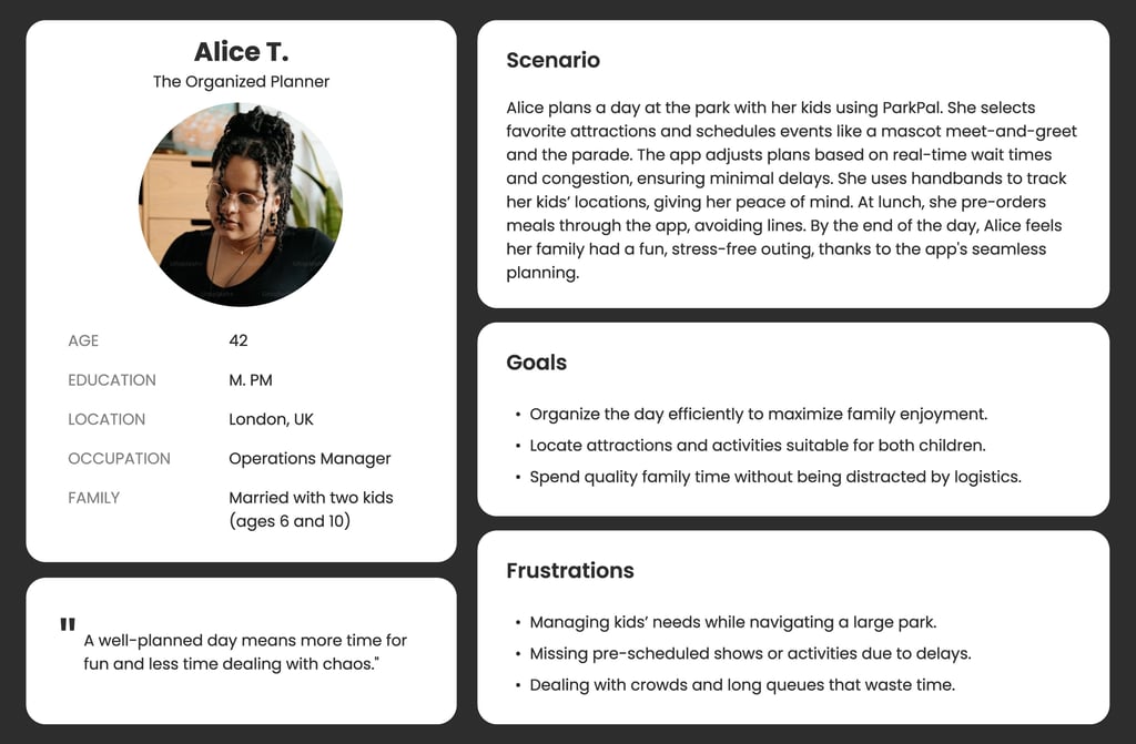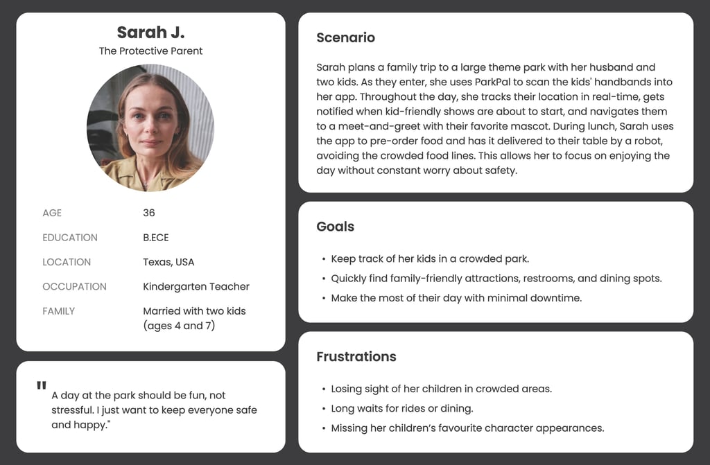 Target Users: Families with children, groups of friends, and frequent park-goers will find its safety features, convenience, and customization particularly valuable. By addressing their specific needs, ParkPal can position itself as an indispensable tool for modern theme park experiences.