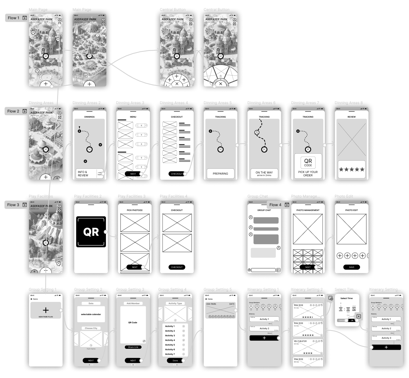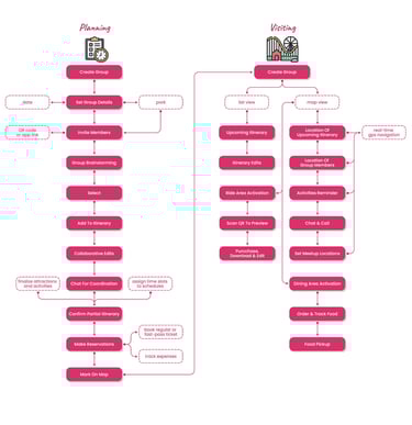 Create an intuitive, adaptable, and accessible app that simplifies planning and in-park coordination. App needs to provide dynamic itineraries, personalized notifications, and easy group management, all while ensuring features like maps, reminders, and food ordering are easy to navigate, even with one hand. Inclusivity and real-time adaptability are key to making the app useful for everyone, regardless of age or technical skill.