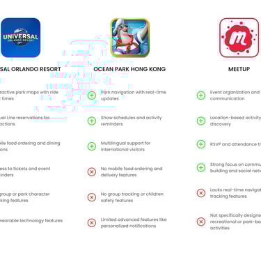 ParkPal has a unique position in the market by combining the best aspects of direct competitors like Disney’s and Universal’s apps with innovative safety and engagement features absent in those solutions. Additionally, it overlaps with indirect competitors like Meetup, addressing group coordination and activity management in a broader context.
