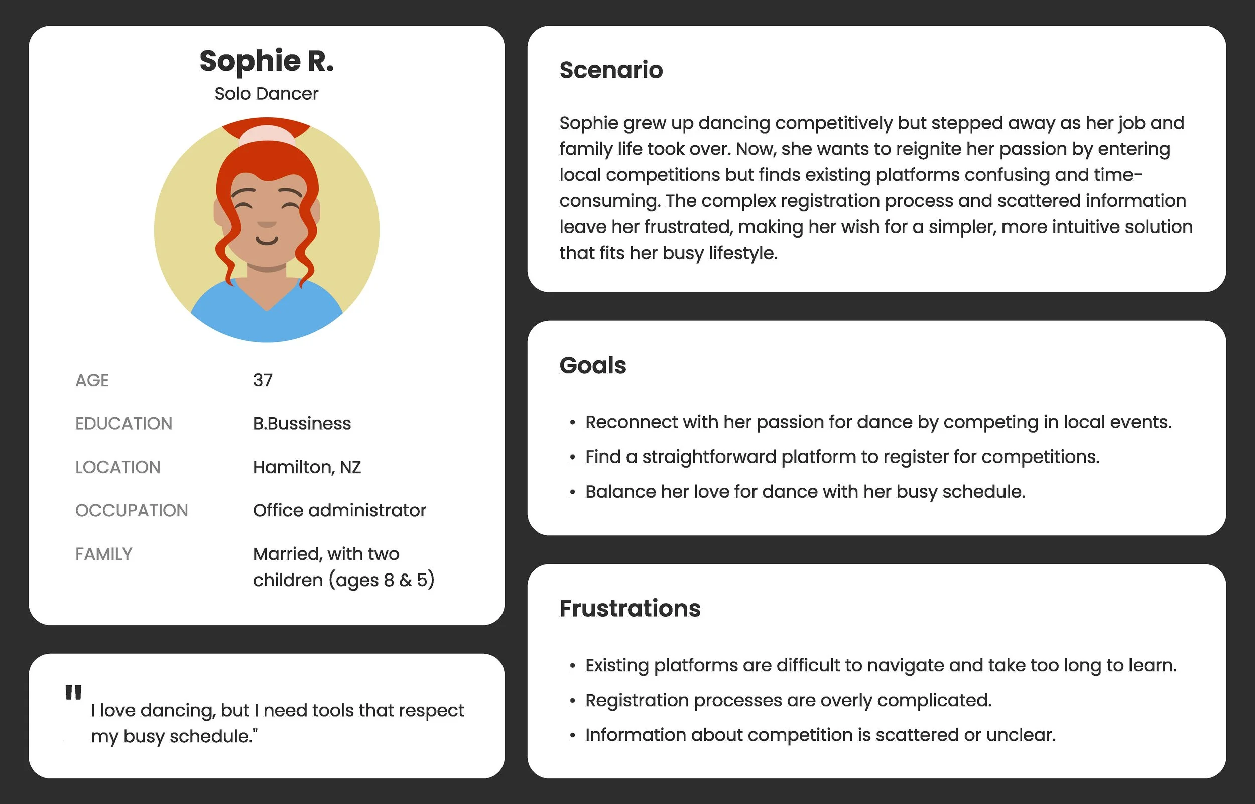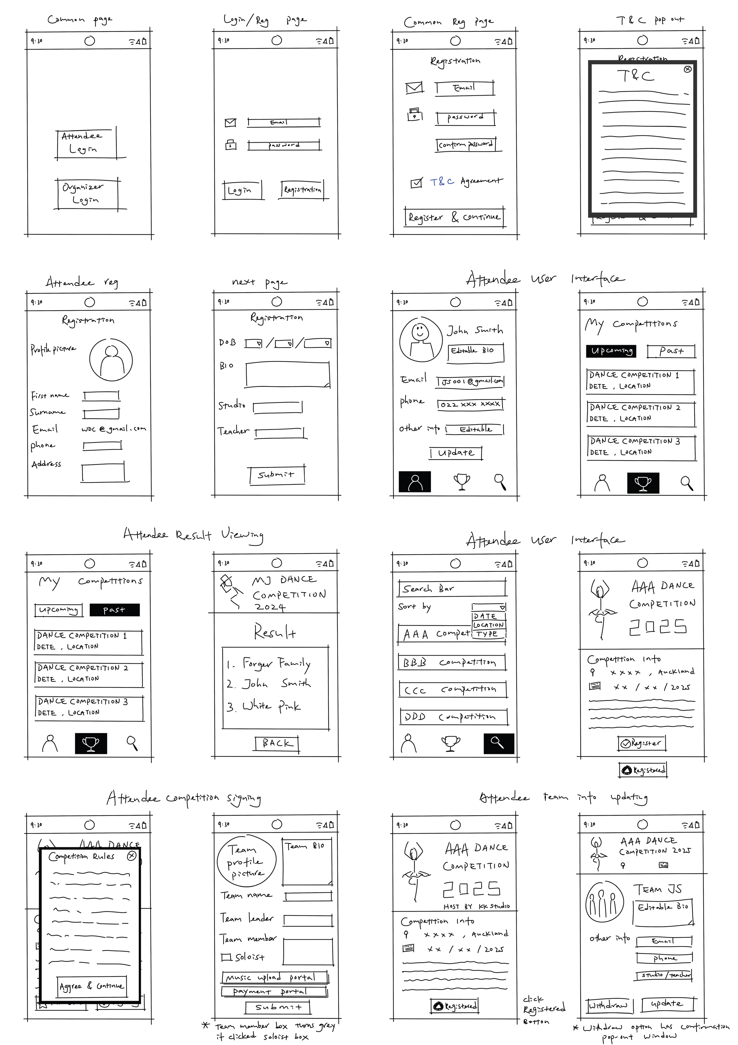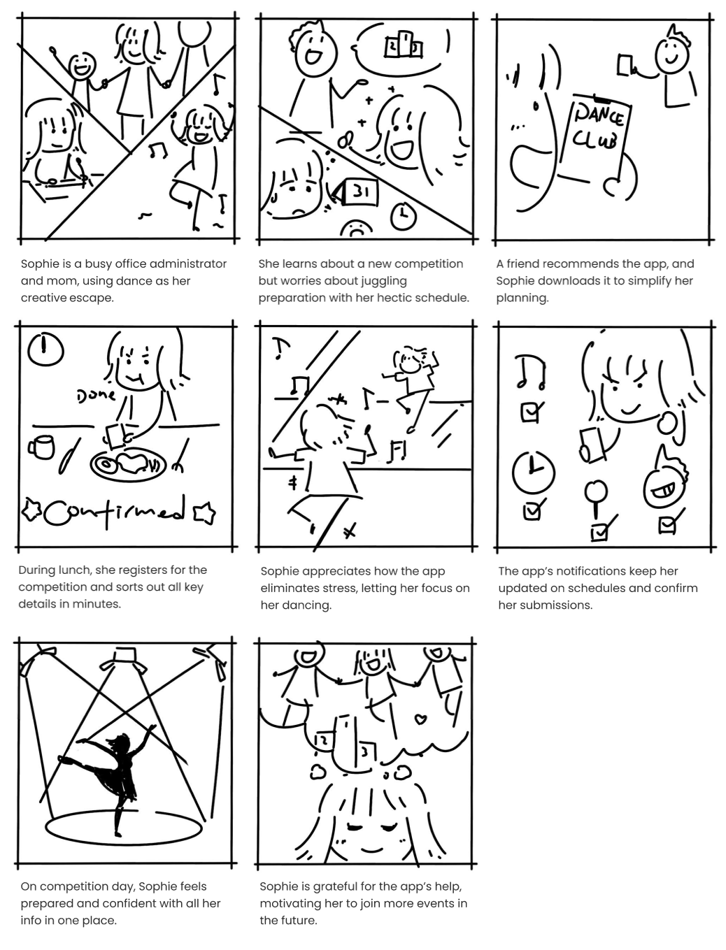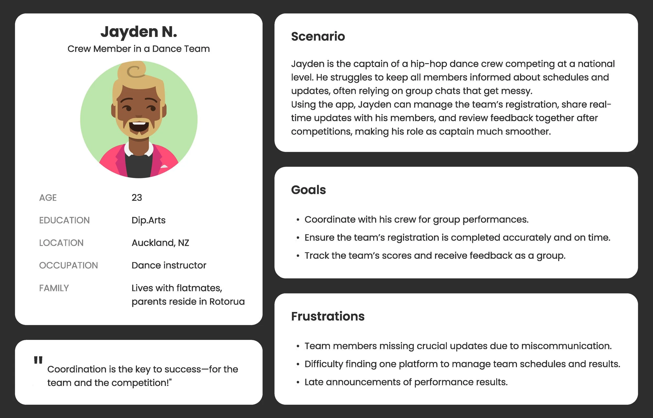 The world of dance competitions has grown significantly over the years, yet the technology supporting competitors remains fragmented and underdeveloped. In New Zealand and beyond, existing dance competition platform apps often fail to meet the needs of their users, leaving room for innovation. Ideation