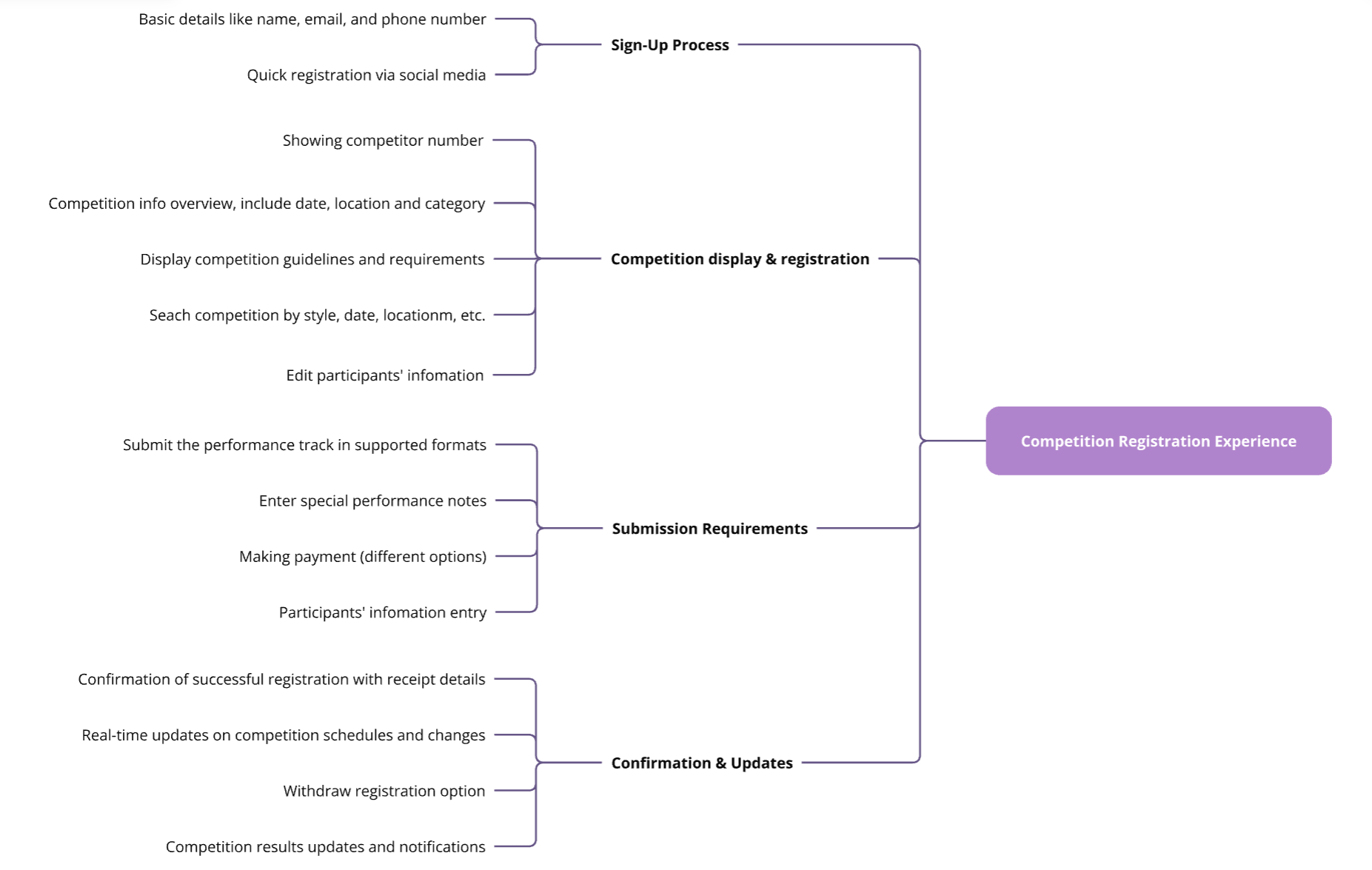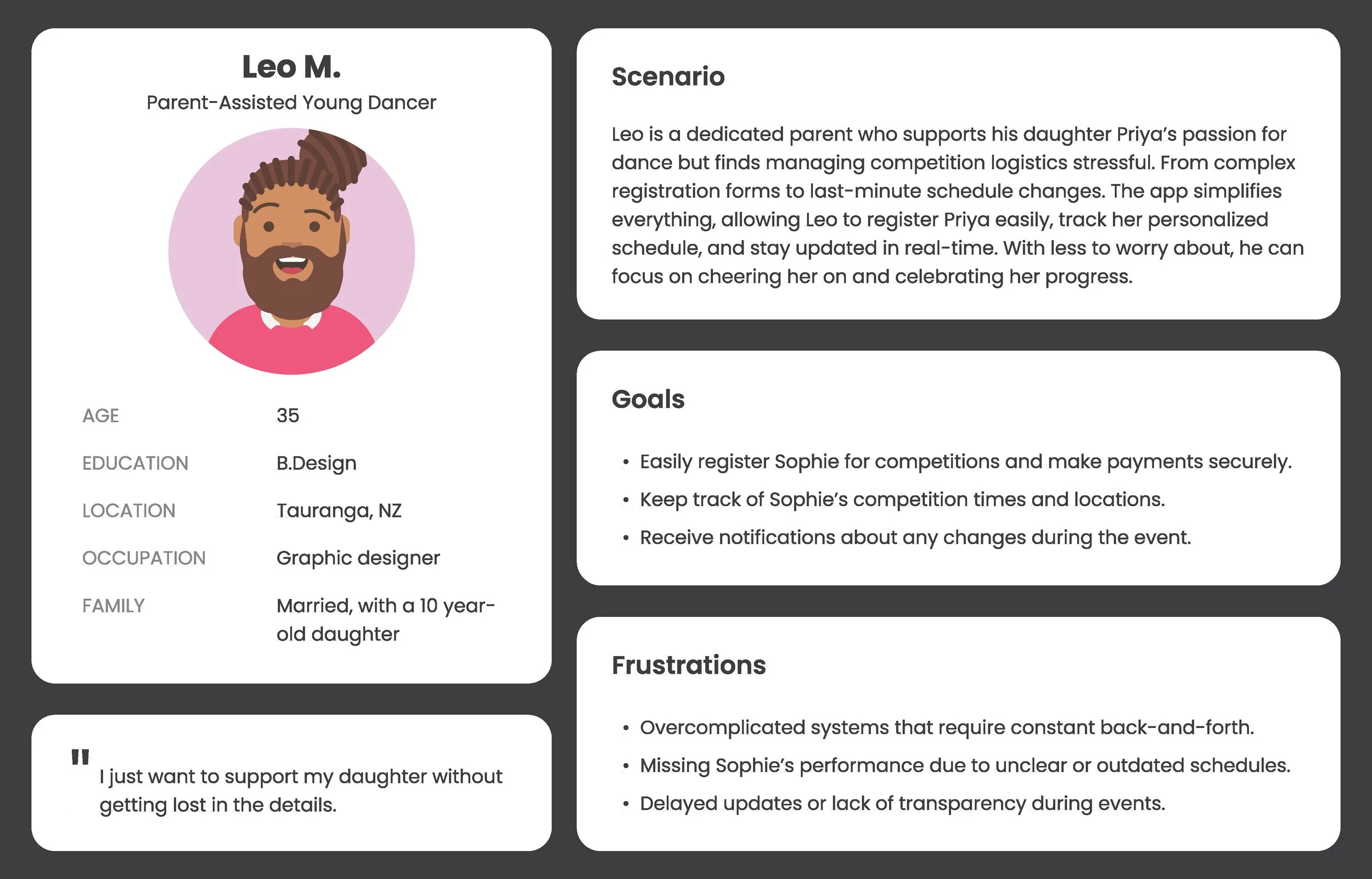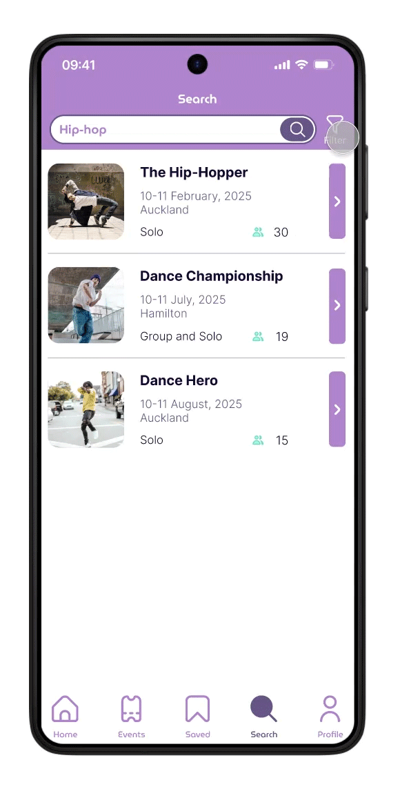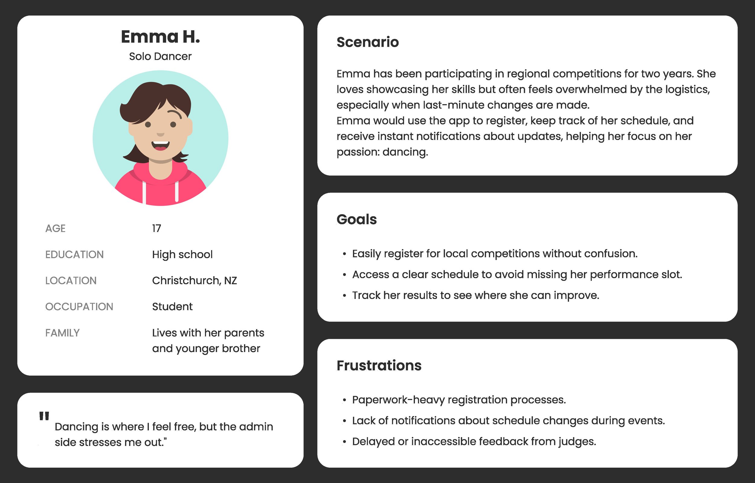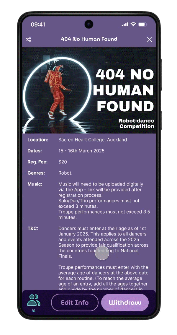 Many dancers are focused on their performances and prefer minimal time spent on logistics. Competitions require manual or fragmented registration systems (e.g., forms, emails, or separate payment portals). This leads to confusion and missed deadlines. Overloading the app with features can make it overwhelming.