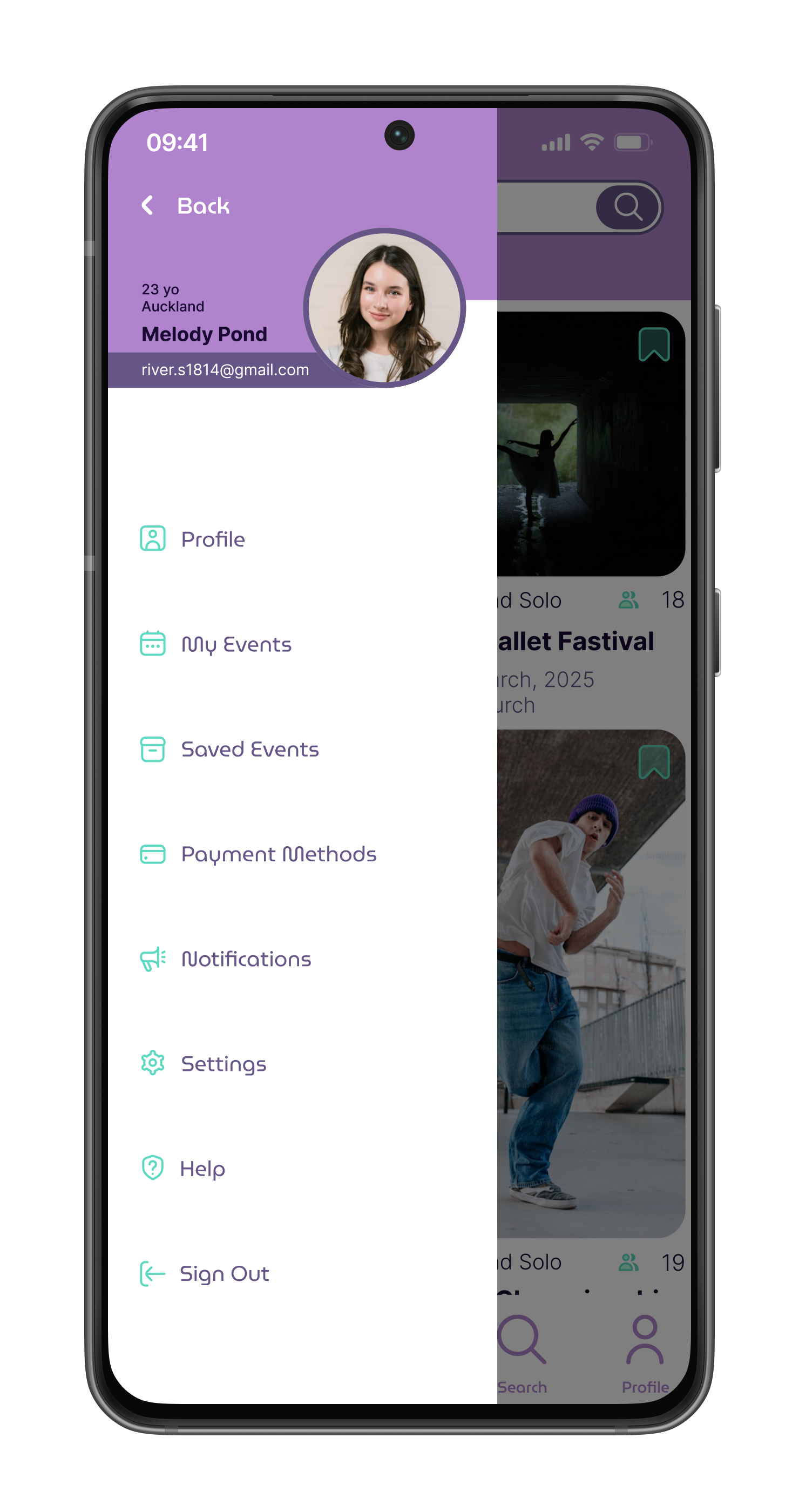 When first launching the app, the user would see the current featured events—scrolling to see more of the events and also keep the focus point at the tab.Expand to more info