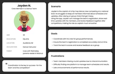 Target Users: Solo dancers and dance crews (both amateur and professional), as they form the core user base. Secondary users, like parents and coaches, can be considered for additional features later to broaden the app's appeal.